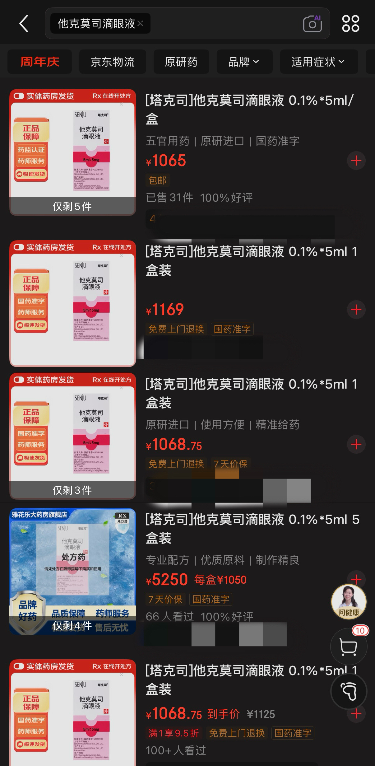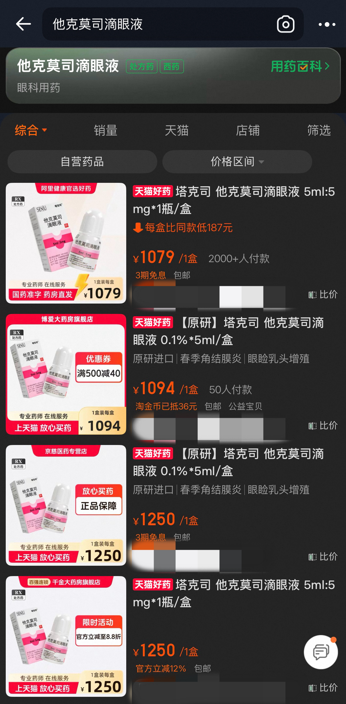 目前他克莫司滴眼液的线上标价仍普遍在1000-1200元/盒。