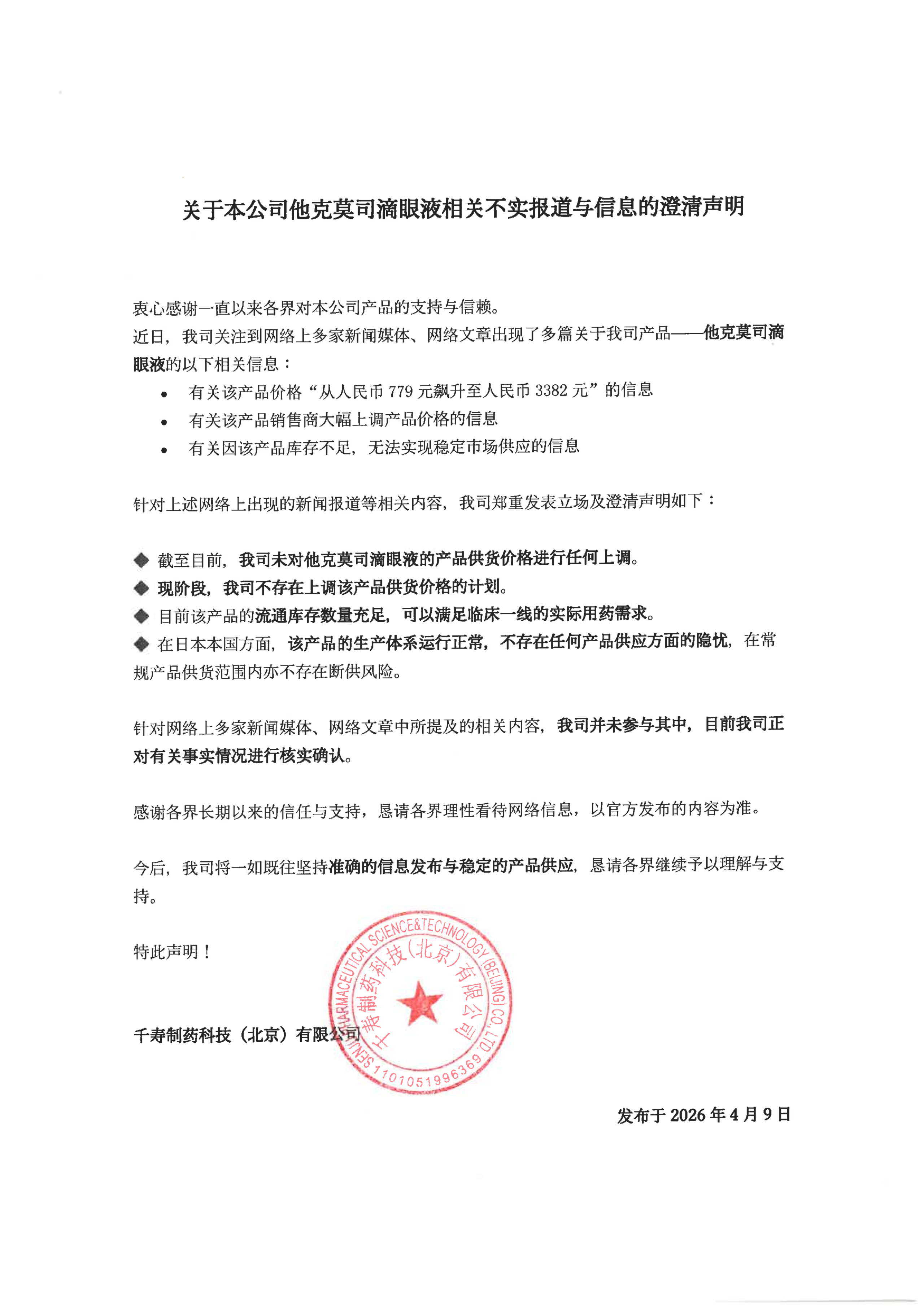 针对上述网络讨论,4月9日晚,他克莫司滴眼液在中国的境内责任人和注册代理公司千寿制药科技(北京)有限公司在官方微信公众号发布澄清声明。