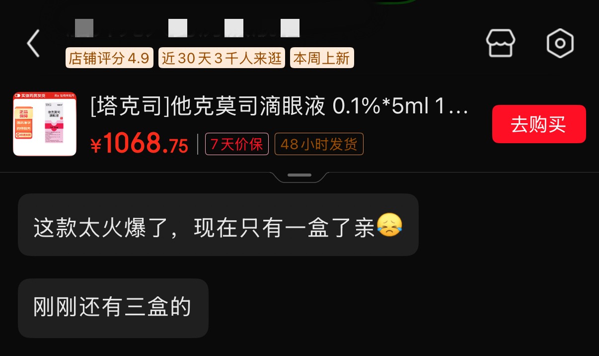 此前有报道称,今年3月初,曾有电商平台对他克莫司滴眼液进行了限购,一个账户31天内只能下1单买1瓶,当时的价格为1100元。