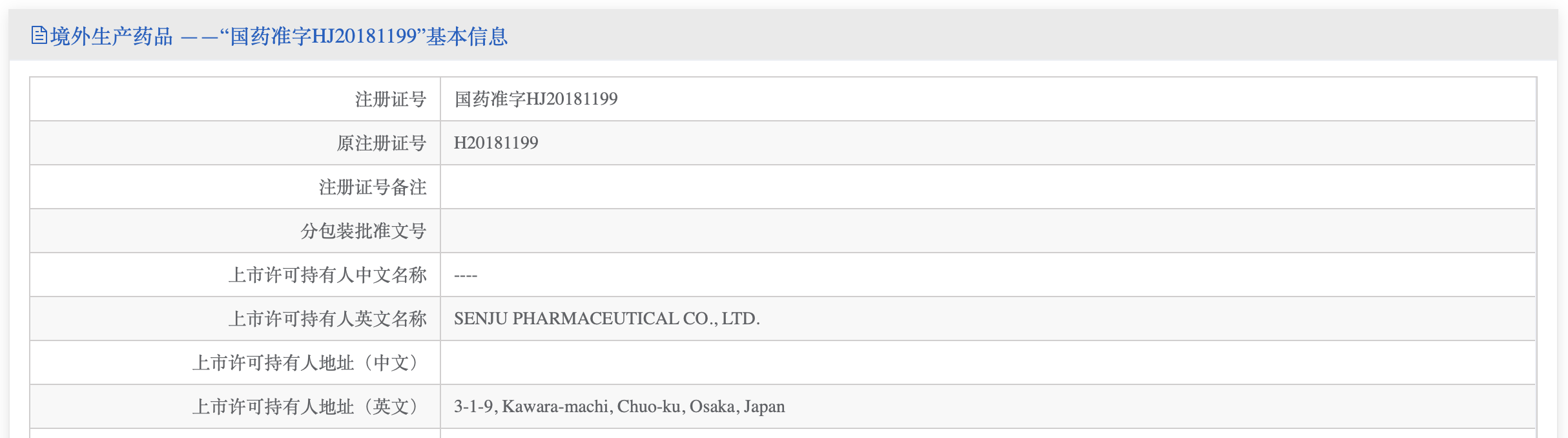 国家药监局数据库信息显示,他克莫司滴眼液为境外生产药品,上市许可持有人为日本制药公司SENJU PHARMACEUTICAL CO.LTD.(千寿制药株式会社),千寿制药科技(北京)有限公司为其境内责任人,主要承担他克莫司滴眼液在我国市场的准入与管理工作。