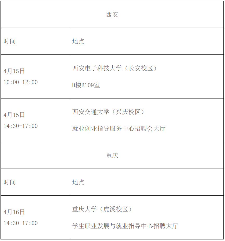 本次招聘将在西安电子科技大学、西安交通大学、重庆大学等高校举行系列招聘活动,现场接受应聘人员咨询和报名(现场报名的应聘人员仍需网上报名,未在规定时间内进行网上报名视为报名不成功。)。活动时间和地点如下: